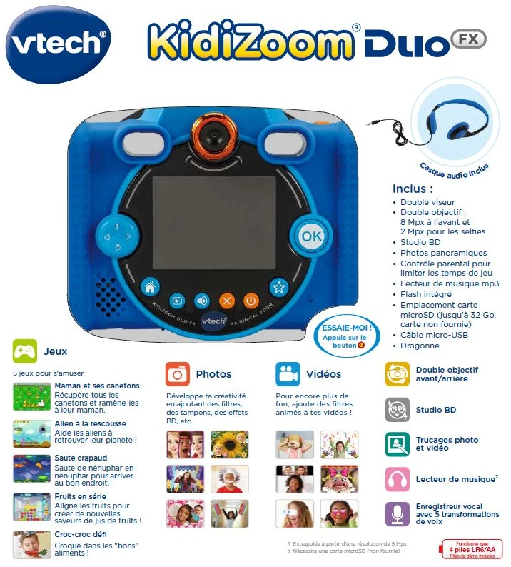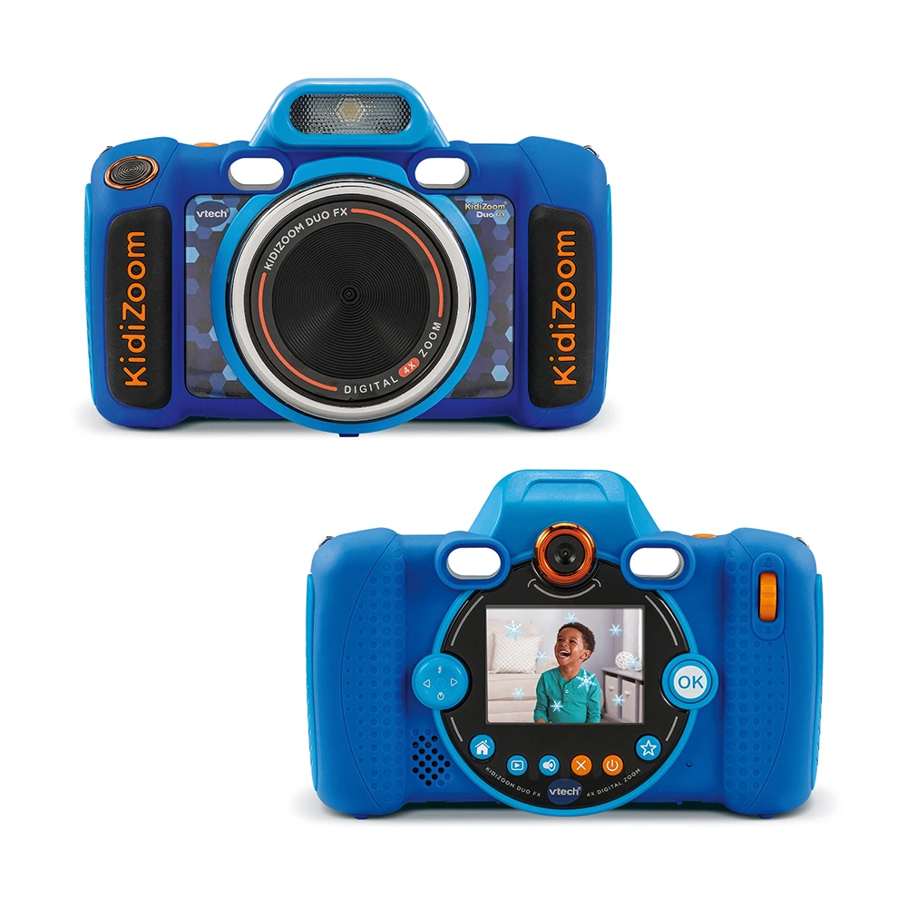 Le KidiZoom Duo FX est un appareil photo numérique multifonction avec flash intégré pour les enfants à partir de 4 ans. En plus de prendre des photos et des vidéos, il permet de jouer, de faire des trucages rigolos, de rajouter des cadres, et même d’écouter de la musique !
