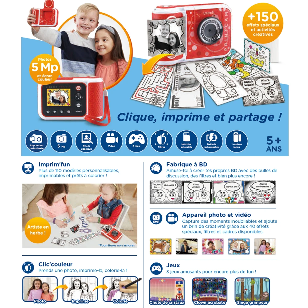 Votre enfant peut aussi créer ses propres bandes dessinées et les imprimer pour les colorier ou les offrir à ses amis ! Il peut également photographier des panoramas, faire des selfies, se filmer en pleine action et jouer aux 3 jeux amusants inclus.