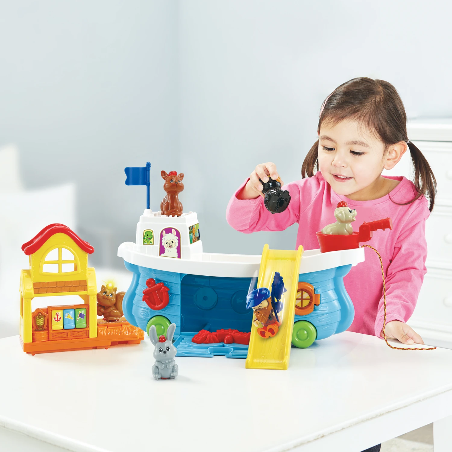 La cabine du bateau peut se détacher pour se transformer en maison et le bouton lanceur permet de faire glisser les animaux sur le toboggan ! L’enfant tire sur la cordelette pour faire rouler le bateau et déclencher des mélodies.