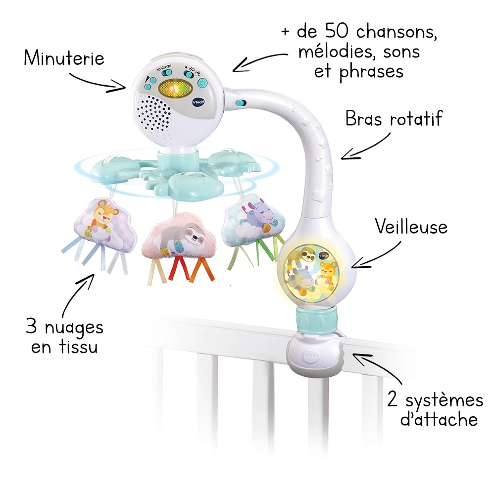 - Capteur sonore : si Bébé pleure, de douces mélodies se déclenchent pour le réconforter.