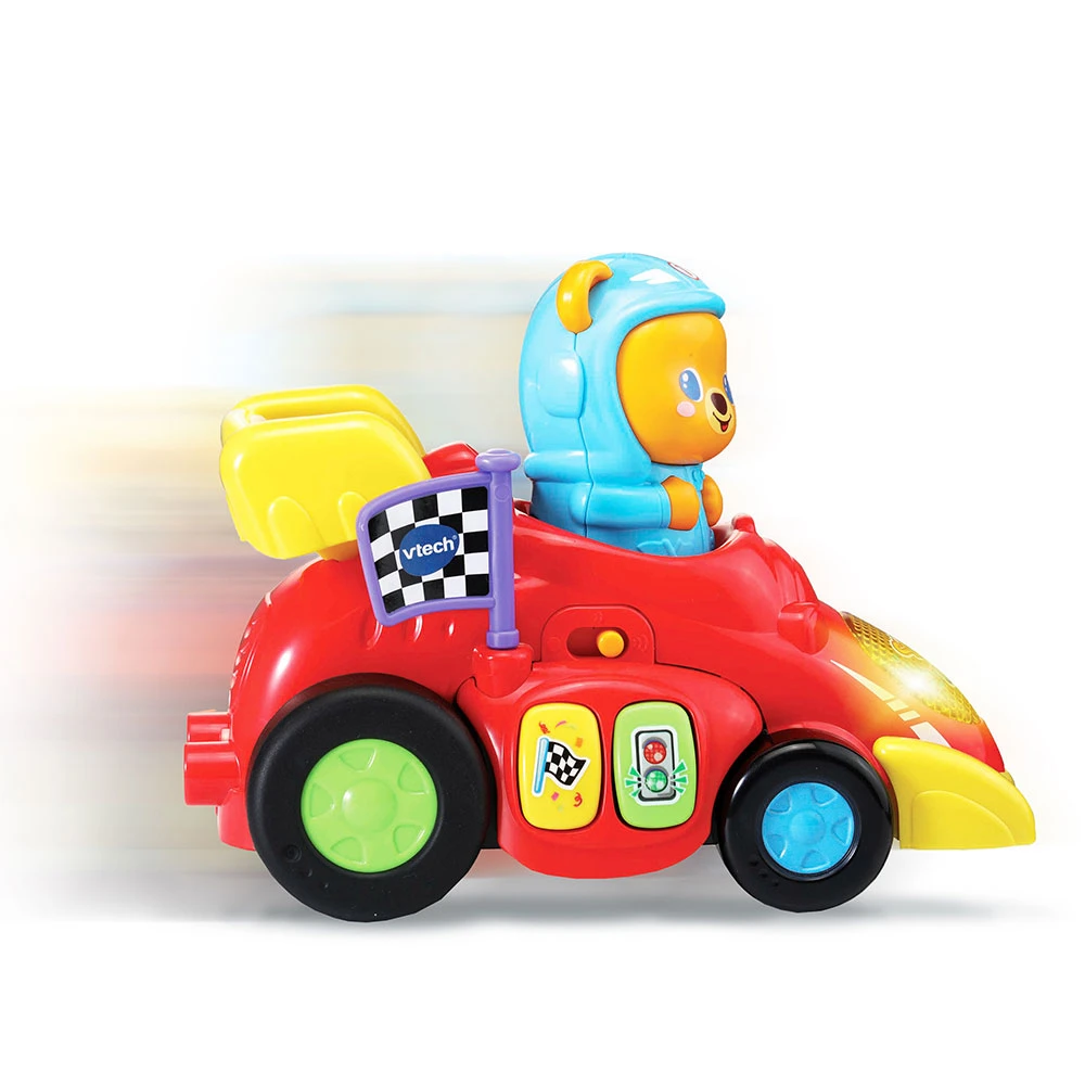 Attention ! Titours, champion de course s’apprête à franchir la ligne d’arrivée. En appuyant sur l’ourson ou en activant le système de rétrofriction, votre tout-petit fait rouler la voiture et aide Titours à se rapprocher de la victoire !
