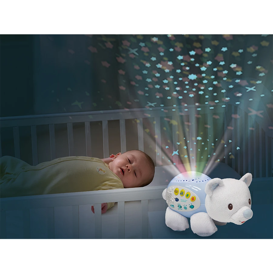 Cette jolie veilleuse de projection musicale et lumineuse avec variation de couleur et capteur sonore accompagne Bébé au pays des songes aux sons de 60 mélodies et 3 berceuses.