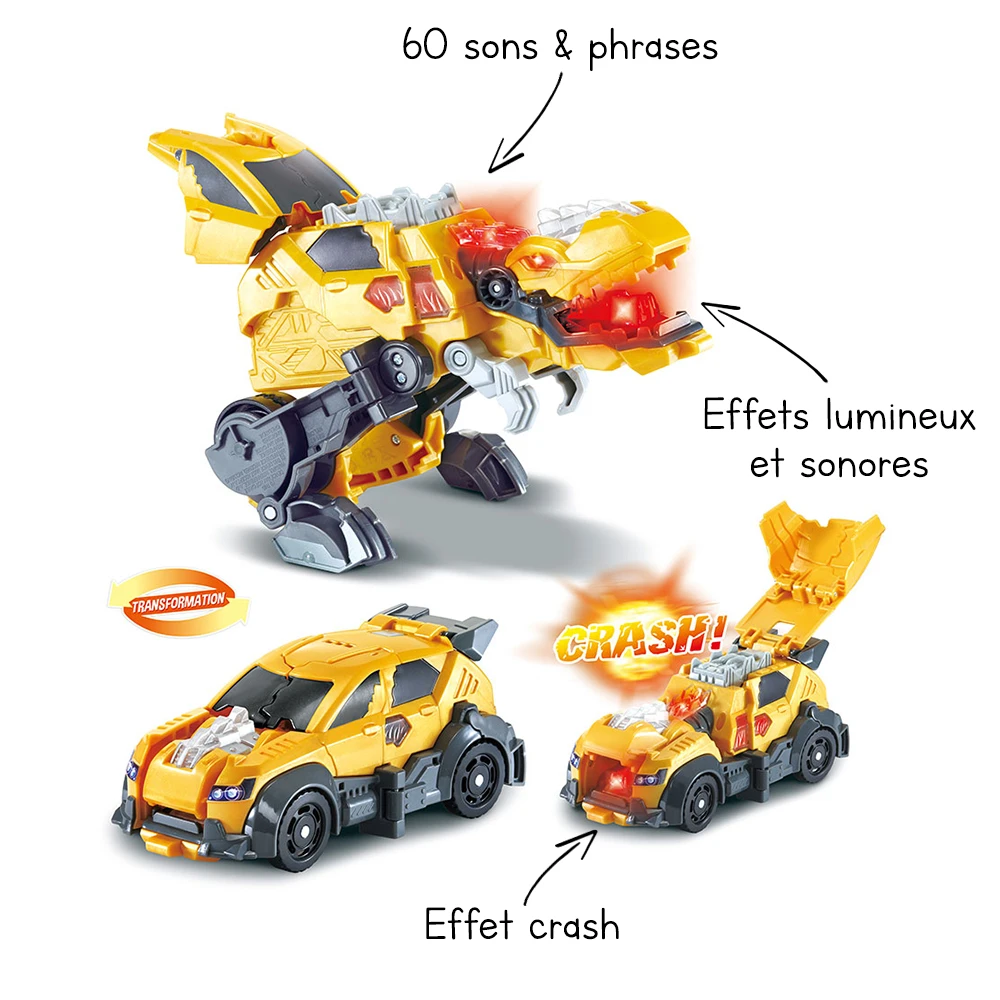 Les Switch & Go Dinos Crash sont très impressionnants : lors d’un impact, ces jouets interactifs se déforment et explosent avec de super effets sonores et lumineux, en mode dinosaure ou voiture !